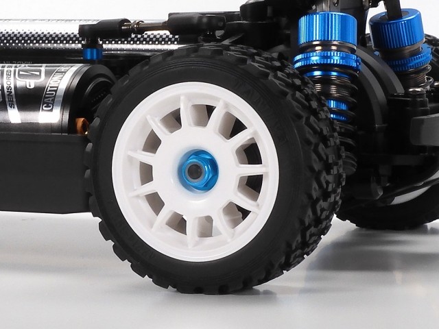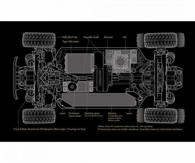 Dette kompakte akseldrevne 4WD-chassiset har en midtstilt motor foran og overfører kraft fra det sylindriske tannhjulet i midten via fremre og bakre mellomaksler. Batteripakken er stående og langsgående, plassert på venstre side, noe som bidrar til optimal balanse. Ved å endre bakseksjonen kan du velge mellom tre akselavstander. Den 4-hjuls uavhengige doble bærearmsfjæringen har aluminium oljedempere. Hjulvinkelen foran er 5 grader, og man kan velge mellom to typer bakkeklaring. Støtfangerens vinkel reduserer også overflatekontakt.