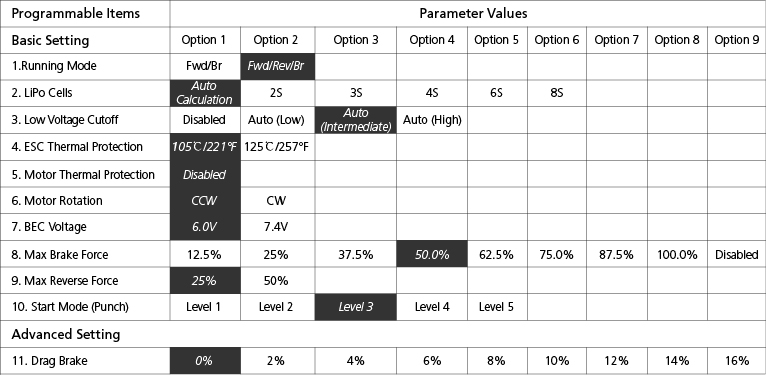 With incredible acceleration capabilities and a rock-solid, stable output, the MAX6 can handle instant full-torque start-ups for wheelies, high-speed racing on straightaways and powering through the bumpiest terrain. The user will have the choice of adjusting the ESC parameters as per his preference and ability.