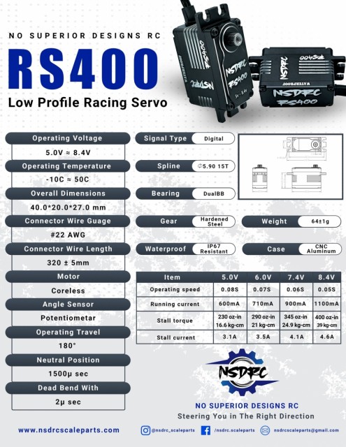 The NSDRC RS400 Low Profile Race Servo was designed with speed and precision in mind. Delivering an incredible 400+ oz-in of torque and 0.05 transit speed at 8.4V, Spec's like these make this servo a top contender for many 1/18 to 1/8 scale on/off road vehicles used for racing, drifting, and anything else requiring lighting fast speed, awesome responsiveness, and great power! Other features include a full cnc aluminum case that provides high durability and improved heat dissipation, an industry leading 5 gear stainless steel gear train that is supported by dual ball bearings, and a high efficiency coreless motor.