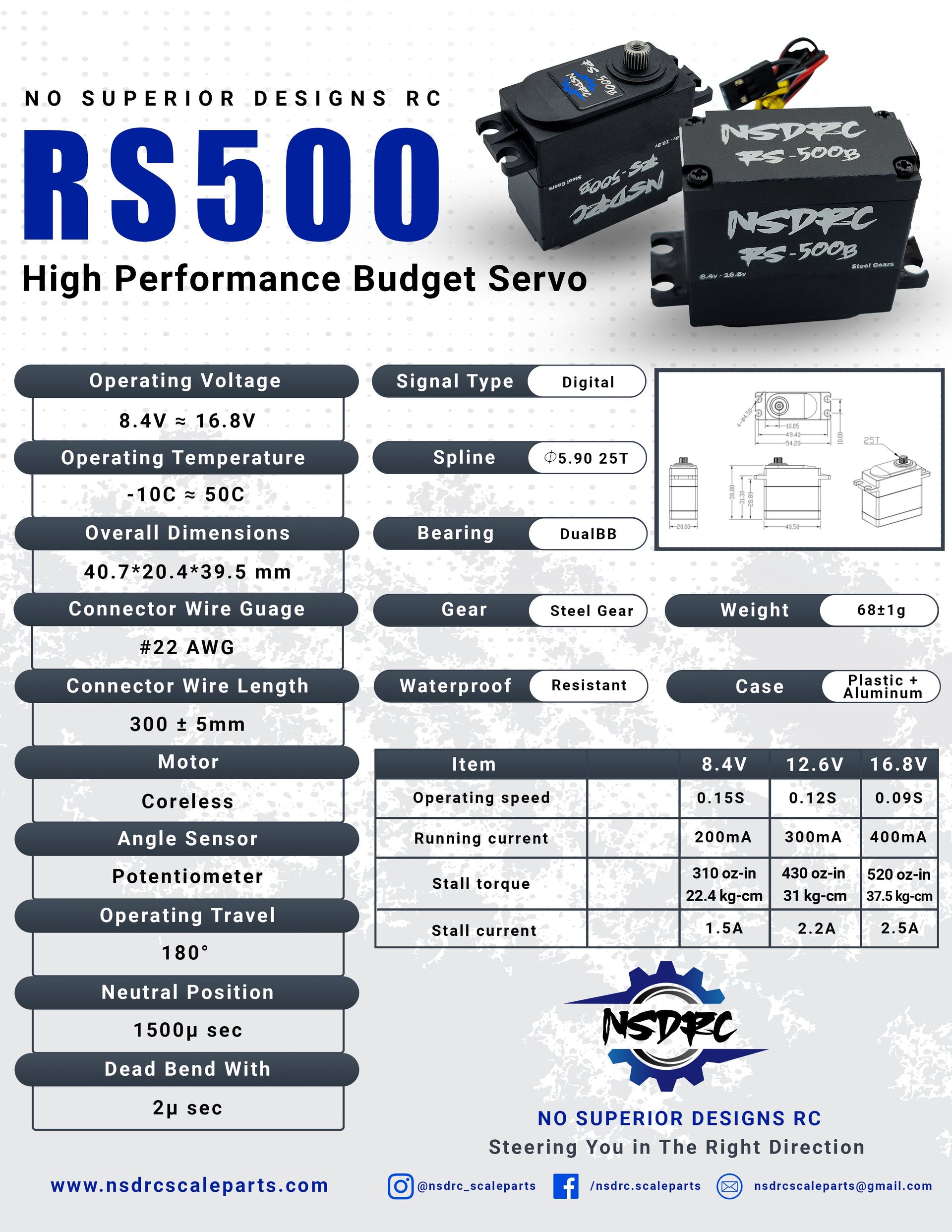 Our budget minded servo that is packed with performance! Stronger, faster, and more durable than all others in its class!! Direct power, 8.4v - 16.8v capable, no extra wiring or costs of a bec in order to get full power. Hardened stainless steel gears, with steel post cap inserts. The top case is a hardened composite, with aluminum middle and bottom case!