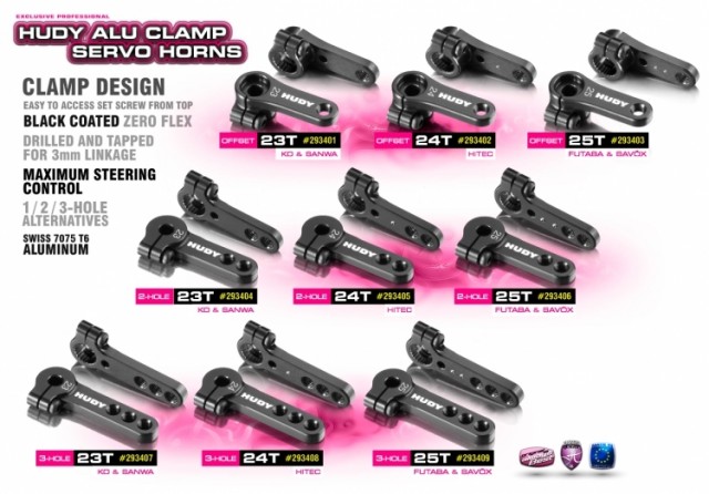 Aluminium servo horns offers maximum steering control by eliminating the flex often associated with composite servo horns. Drilled and tapped for 3mm-linkage hardware. Laser engraved for easy identification.