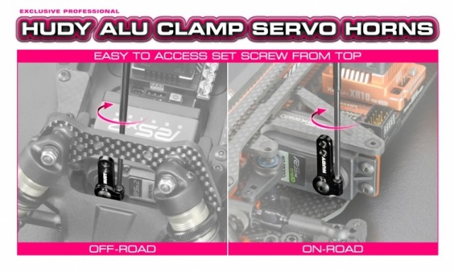 CNC-machined alu servo horns for use on steering servos. Clamp design allows easy assembly.