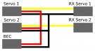 New and improved with thicker 22ga wire and lower resistance for more power! This adapter allows the use of an external BEC for dual servo power without needing to disable your ESC´s internal BEC. Servos connect to +/-/signal plugs and BEC connects to +/- plug. Signal/- and signal connectors plug into the servo RX channels. Includes additional signal plug for controlling a second servo. The servos get signals from the RX and share a dual ground path to both RX and external BEC to prevent floating ground issues. A must-have for any crawler running over 300 ounce/inch servos!