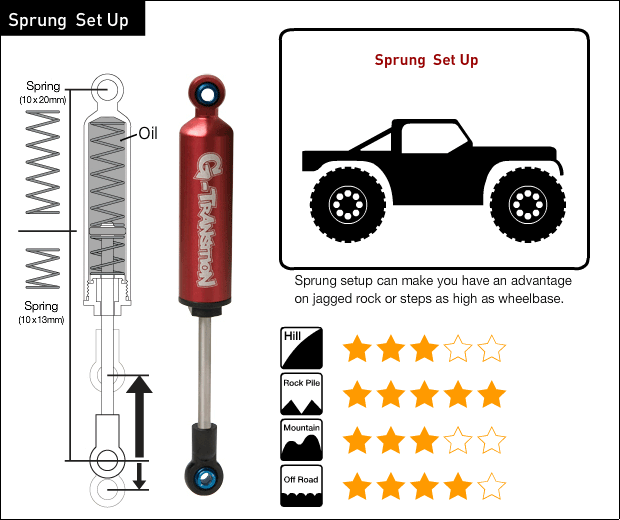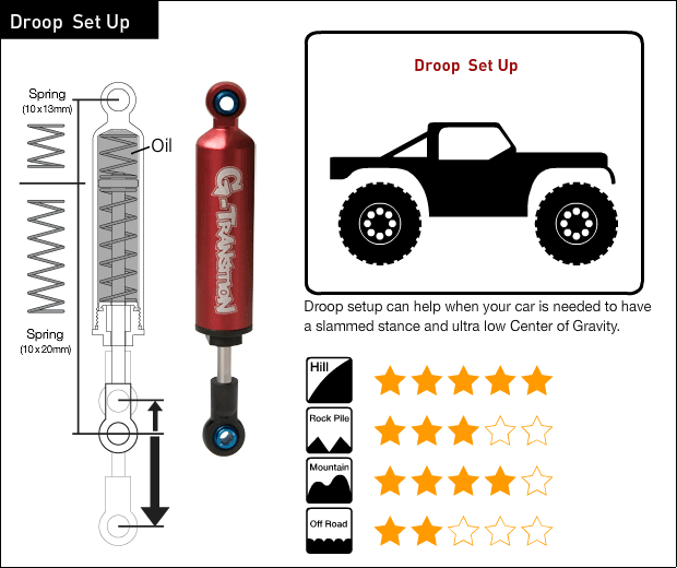 Length (Mounting hole to hole): 80mm (for Droop set-up), 87mm (for Sprung set-up)