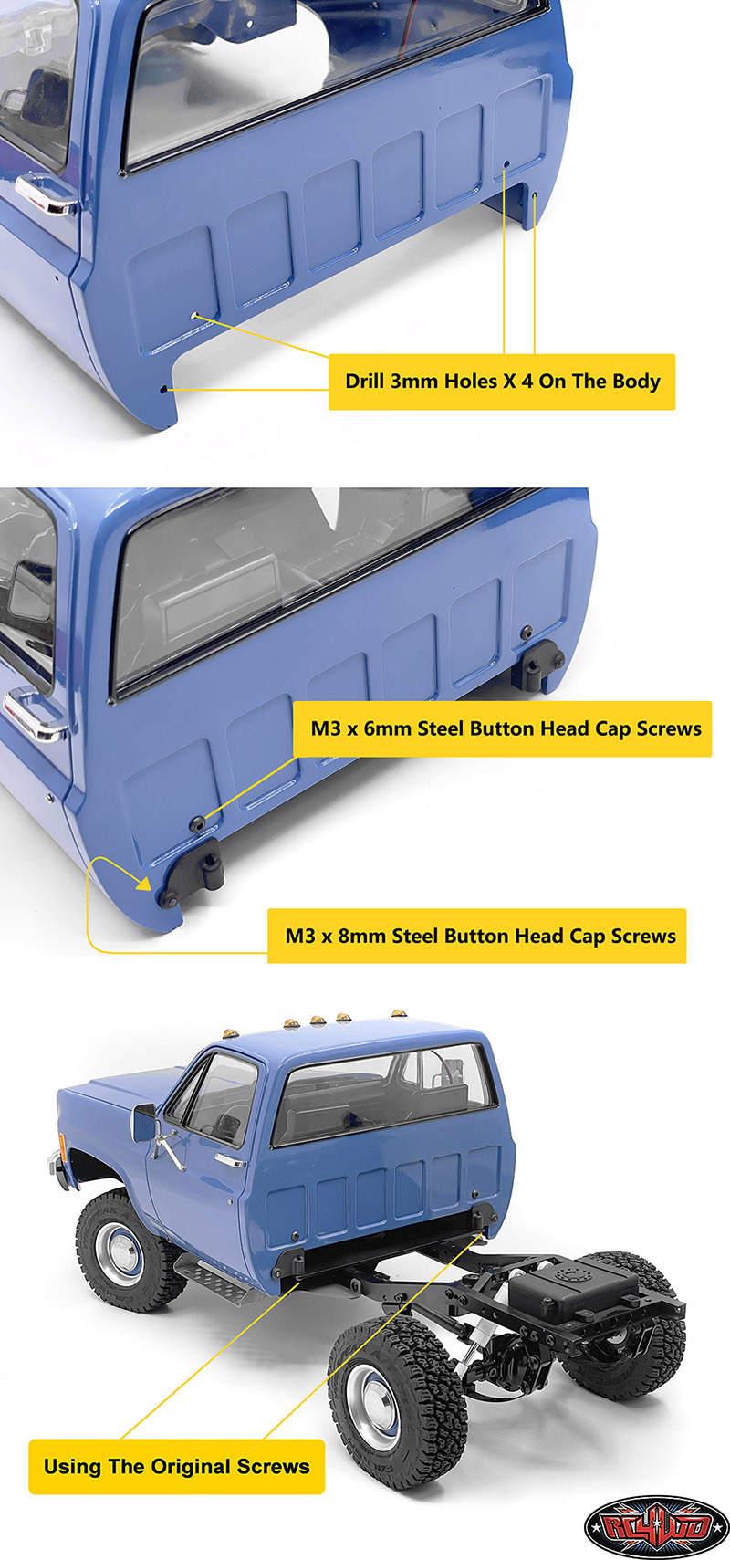 Shown installed on RC4WD Trail Finder 2 "LWB" RTR W/ Chevrolet K10 Scottsdale Hard Body Set (Red) (Z-RTR0066) (painted blue) with LED Cab Lights for RC4WD Chevrolet Blazer and K10 (VVV-C1474), Towing Mirrors for RC4WD Chevrolet Blazer and K10 (VVV-C1476) and Side Steps for RC4WD Chevrolet K10 Scottsdale (VVV-C1477) for example (Not Included)