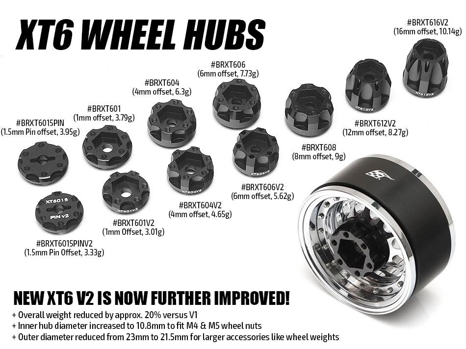 Boom Racing ProBuild™ XT608 V2 6-Lug Aluminum 12mm Wheel Hub Adapters 8MM Offset Version 2 (2) Black
