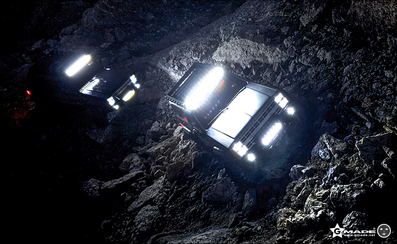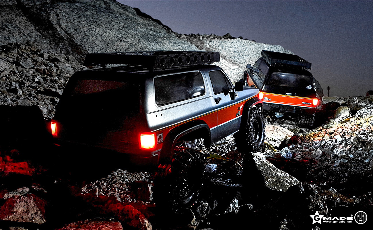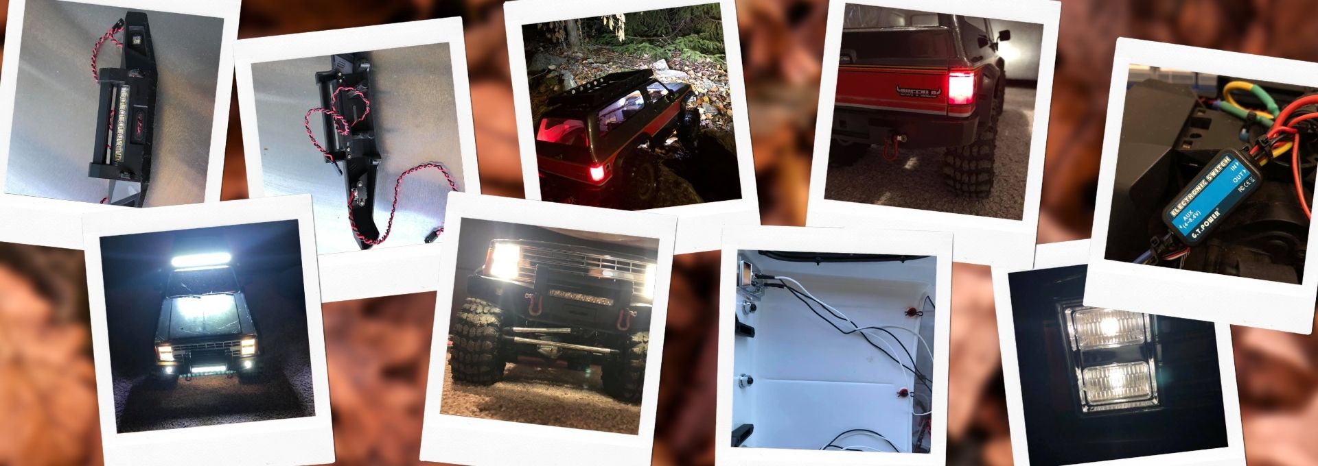 Hovedlys og baklys har 5mm runde ledpunkt som festes i holdere i body. Disse er i varmhvit utførelse og gir en meget fin skala likhet i hovedlyktene foran. Helt passe lysstyrke og kler bilen godt. Settet henter ut strøm via mottaker. Til frontfanger og takgrind har Gmade gjort det slik at en skal bygge ledbarer selv. Synes dette var gøy og litt utenom det vanlige.