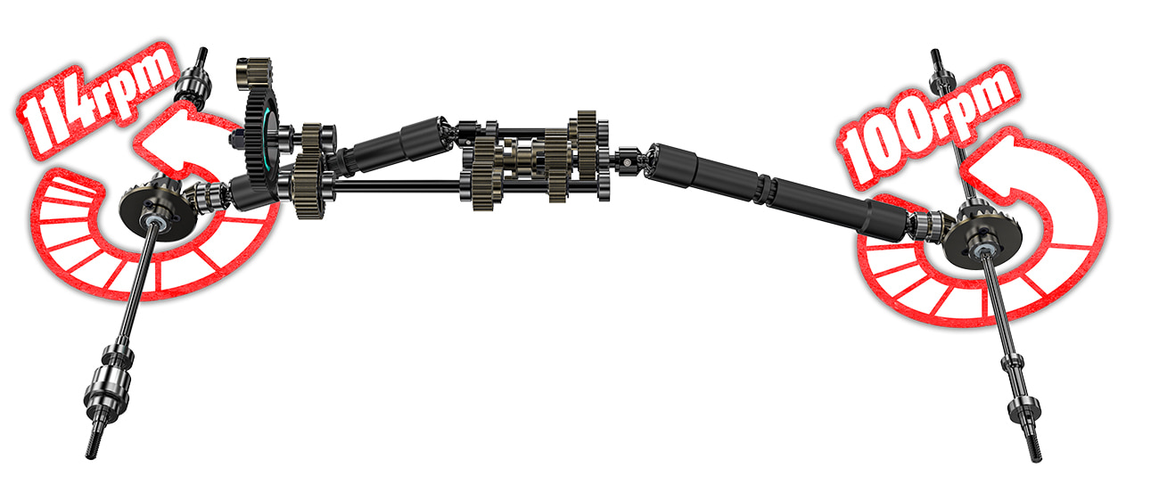 The GS02F transmission is designed to rotate the front wheel faster than the rear wheel.