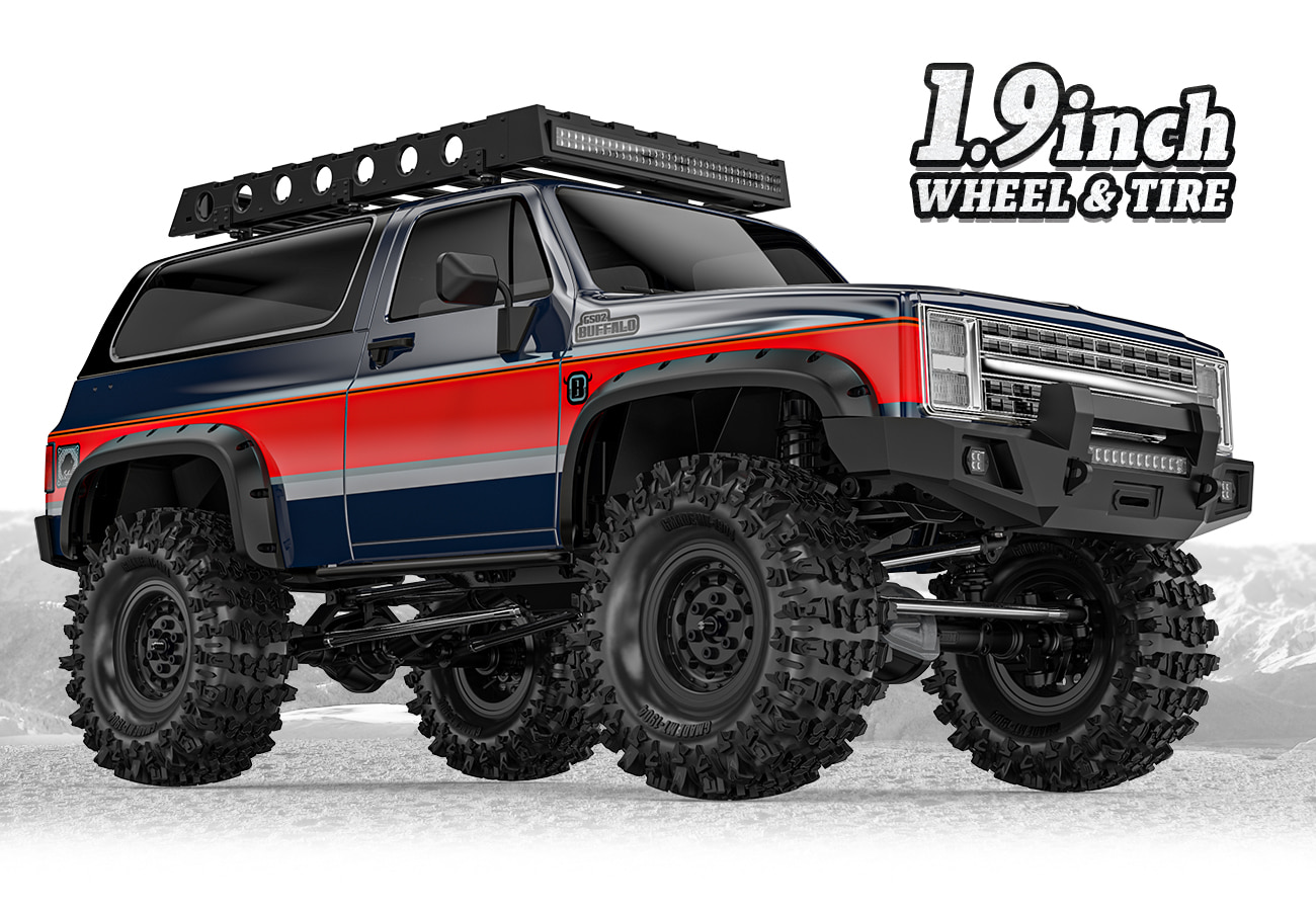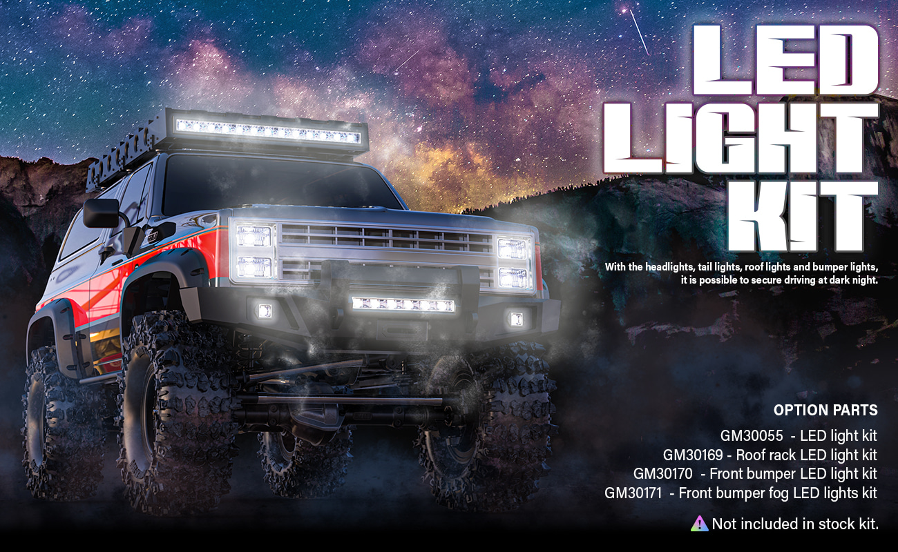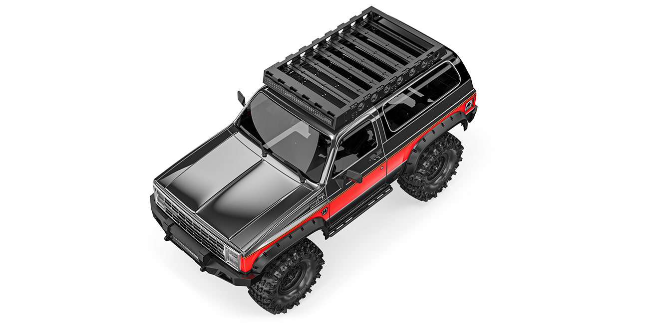 To add realism details it includes front grille, light bucket, side mirrors, wipers, door handles, overfenders and a roof rack & LED light bar so you can tune into a realistic off-road vehicle to matches the concept of off-road adventure.