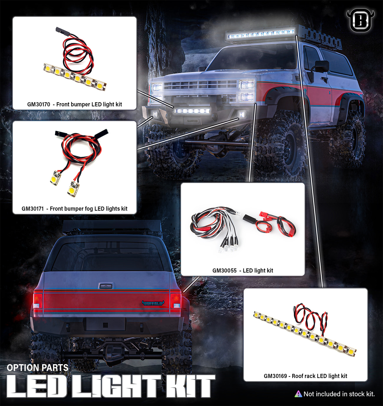 Det følger ikke med lyskit i byggesettet, så det må kjøpes utenom. Gmade leverer 4 forskjellige LED lyskit som passer til Buffalo karosseriet, og disse er såpass billige at sluttsummen for full belysning på bilen er langt under feks lyskit til Traxxas sine modeller.