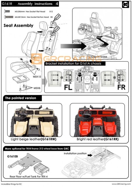 GRC Interior Cockpit Interior Set for Traxxas TRX-4 BRONCO Creamy White for Traxxas TRX-4 PrisNOK545,00 inkl. mva. På lager: 1 stk. Antall Kjøp Ønskeliste Lagerstatus: På lager: 1 stk. Artikkelnr.: GRC/G161RW Produsent: GRC Del dette Produktinfo Produktanmeldelser (0) Fit for TRX-4 Bronco Features: It can be installed simply and quickly on the basis of the original frame layout; the interior details are restored to the greatest extent; the doll´s leg space is reserved, and the doll does not need to be "amputation" on the car; the four degrees of freedom of the seat are adjustable. It can DIY install the motor cooling fan, hidden ESC cooling fan, a back fan of air-conditioning outlet, instrument light, steering wheel linkage. Skriv en produktanmeldelse og del dine erfaringer med dette produktet med andre kunder. Email Navn Din vurdering? 1 star 2 star 3 star 4 star 5 star 6 star Oppgi en tittel for anmeldelsen din Skriv inn produktanmeldelsen i feltet under