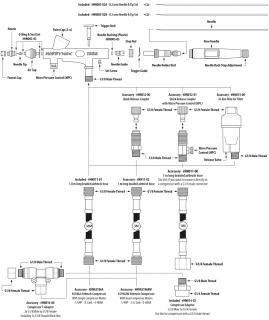 The TARA is a complete set that is ready to be used and it connects easily to the Hobbynox Airbrush Compressors or any other airbrush compressor that has an G1/8 BSP male threaded coupler.