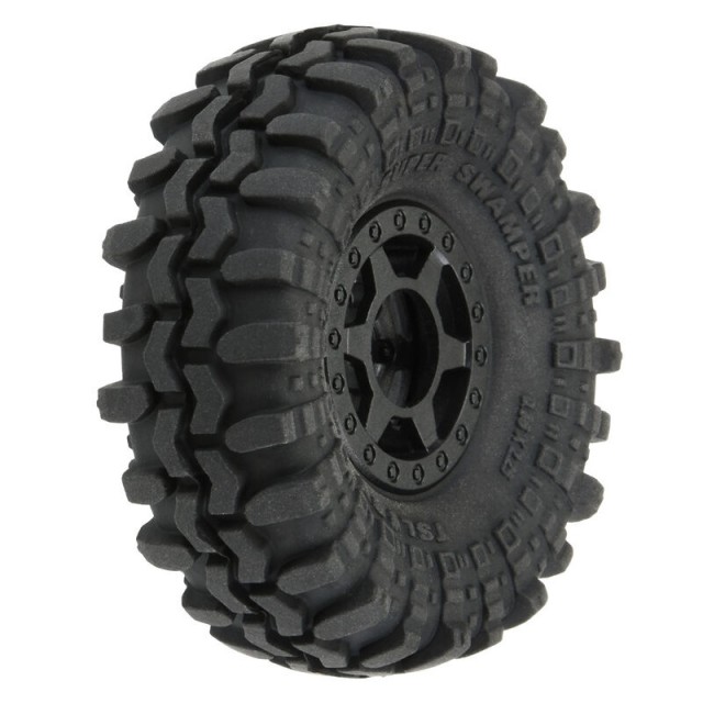 The Super Swamper® 1.0" tire comes in a set of 4, conveniently pre-mounted to our Mini Holcomb Black Internal Bead-Loc 1.0" Plastic 7mm Hex wheels! Just like Pro-Line's 1:10 size Holcomb wheels, these mini versions give your 1/24 crawler a unique, retro-inspired look and are super easy to use by only requiring 3 screws per wheel for mounting tires. The unique 3-piece plastic wheel design bolts together in the back and locks onto Pro-Line's 1.0" Crawling Tires, while also being compatible with many existing 1.0" tires for the SCX24™. The wheels also feature a +2mm offset for a wider, more stable stance. If you own an SCX24™, then Pro-Line's pre-mounted set of Interco Super Swamper® 1.0" Tires are a must-have! Get your set today!